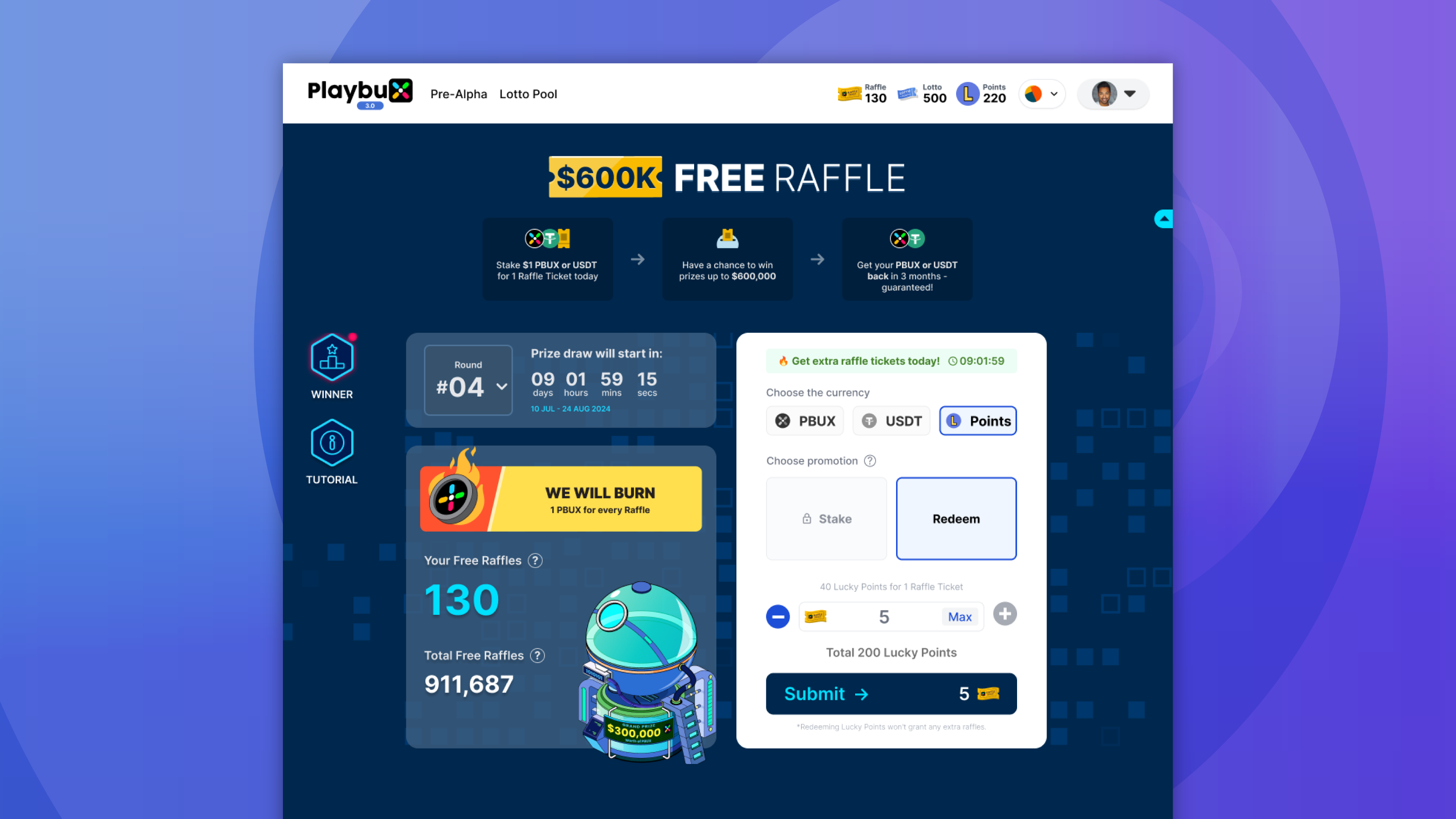 Lucky Points also give you access to the Playbux Free Raffle, where you can win a share of $300,000 every month. Exchange 40 Lucky Points for one Raffle Ticket and secure your entry. From Round 6 onward, the ticket cost will be adjusted to 100 Lucky Points per entry, so now is the perfect time to participate.