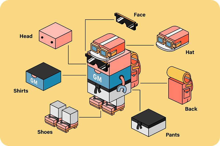 Most NFT in the market are unique. They are combination of parts or properties which combine into a single unique NFT. And the smart contract prevent any NFT to have the same exact part set. Some parts are rare which make the NFT having it rare. But it restricted how users can customize their own character in the metaverse to express their style. We use the different approach by making all parts customizable and make all parts an NFT. There will be 7 parts that users can change. Hat, head, face, Shirts, Back, Pants and Shoes.